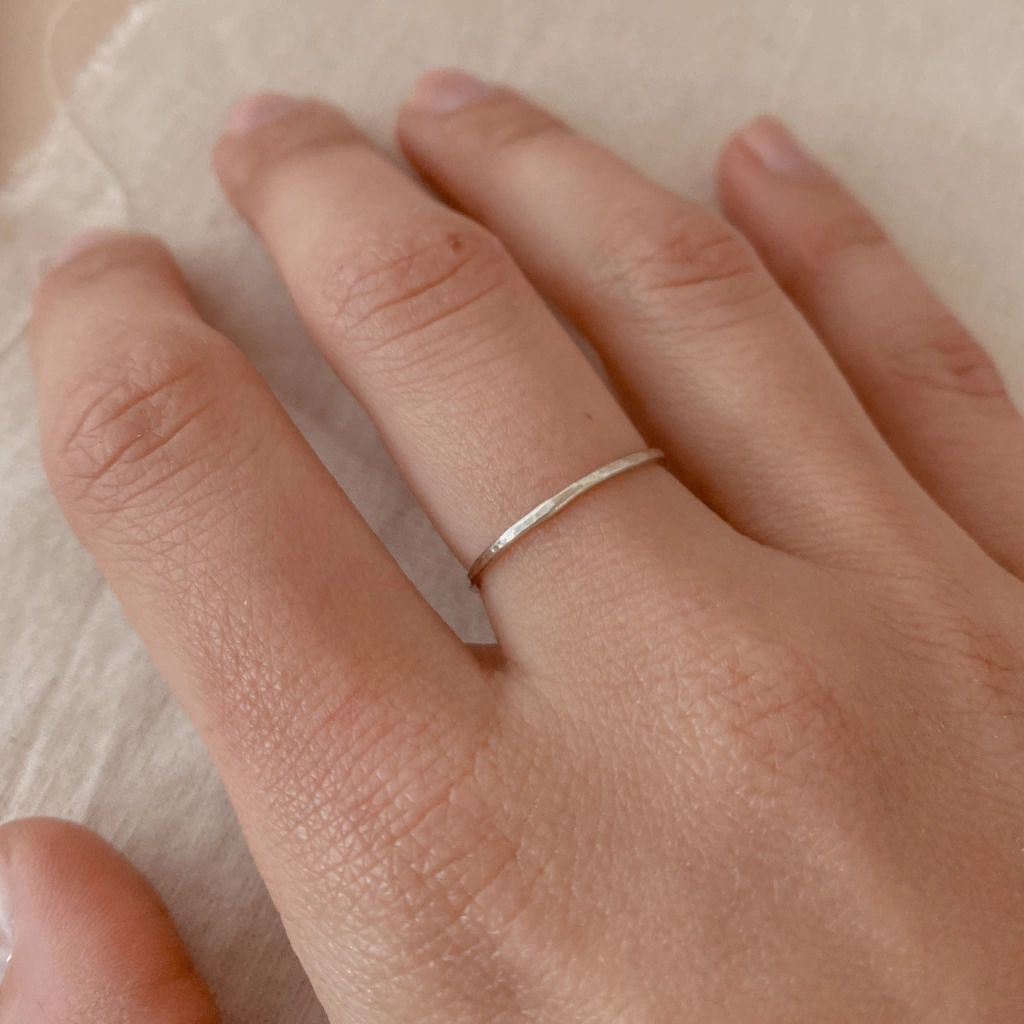 Anel delicado com aro levemente arredondado e acabamento marteladinho, medindo aproximadamente 1.2mm de largura.