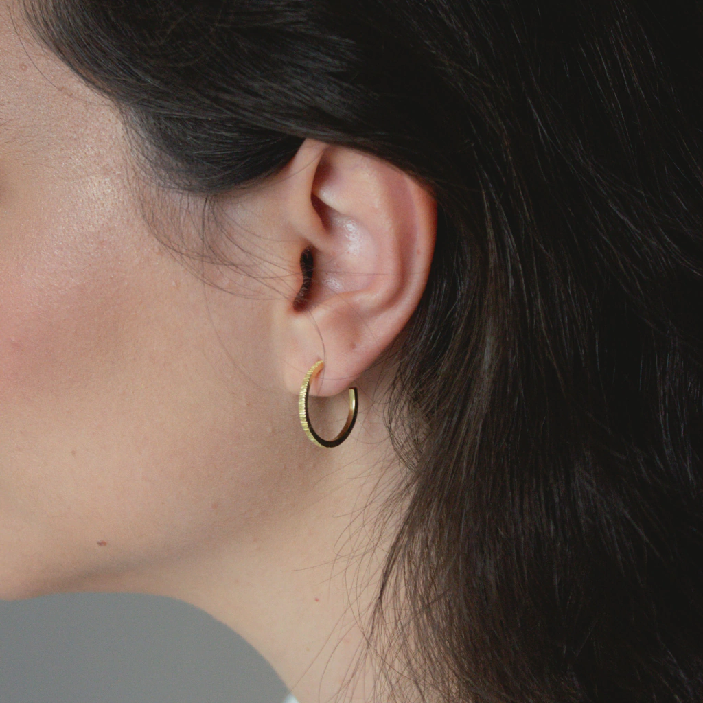 Argolas em prata 950 com banho de ouro 18k, acabamento texturizado e polido. Acompanha tarraxas.