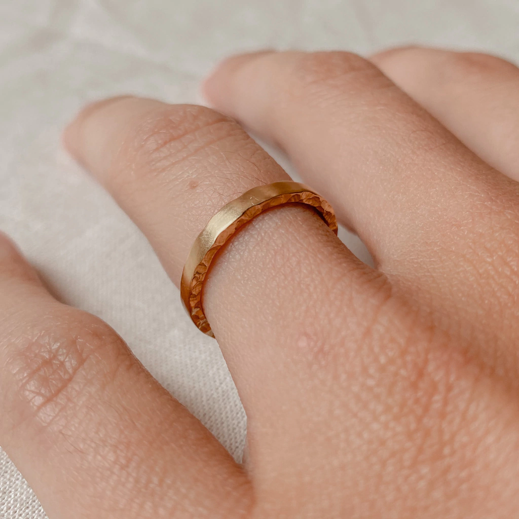 Alianças quadradas com textura orgânica na lateral e acabamento escovado.