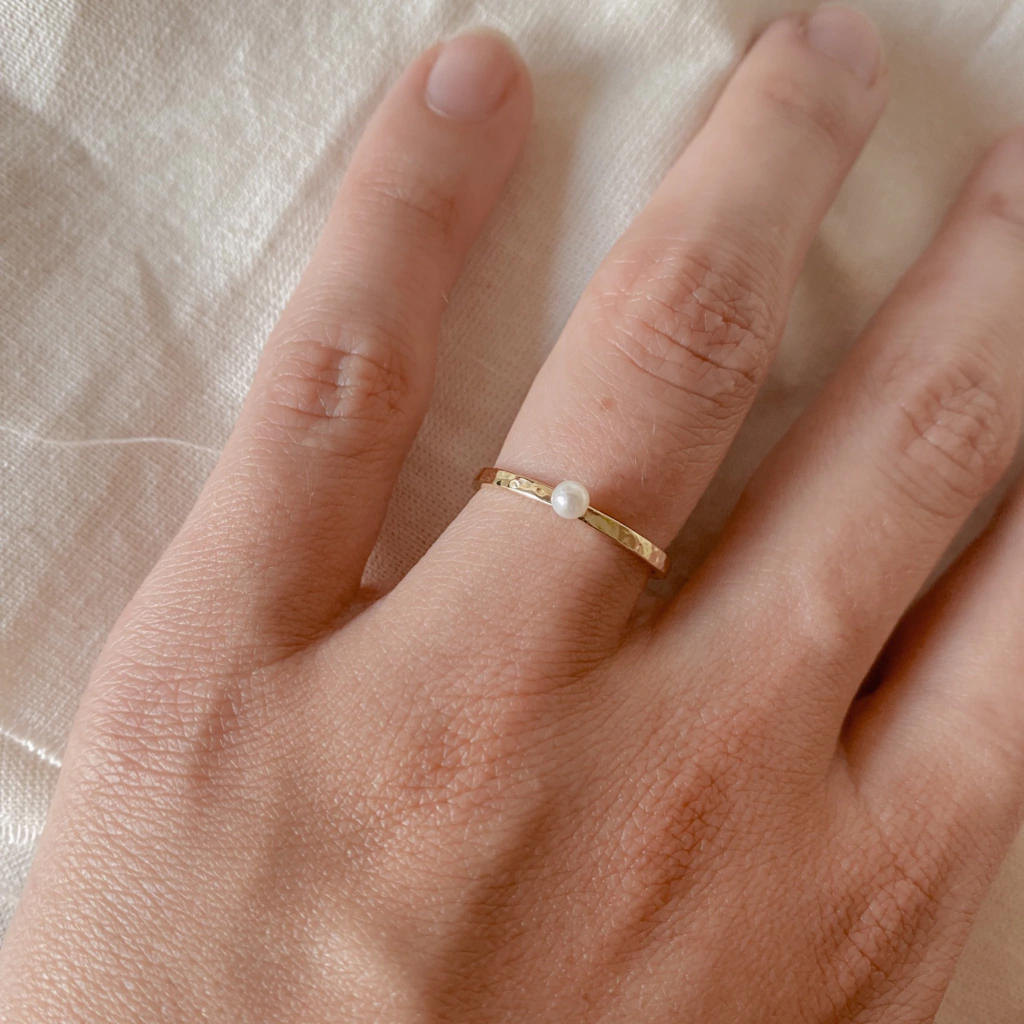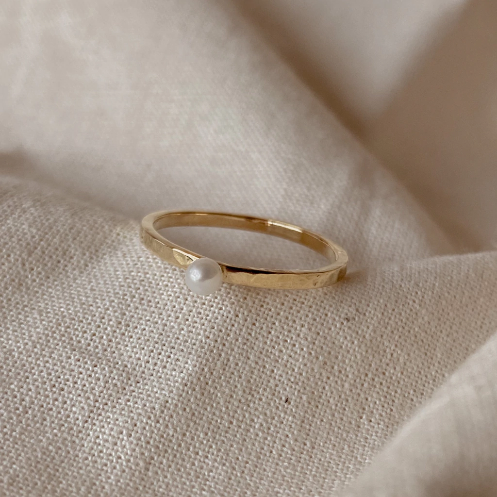 O Solitário Pérola Só é delicado e singular, com aro quadrado levemente martelado e adornado com pérola de água doce (2.5mm, aproximadamente).